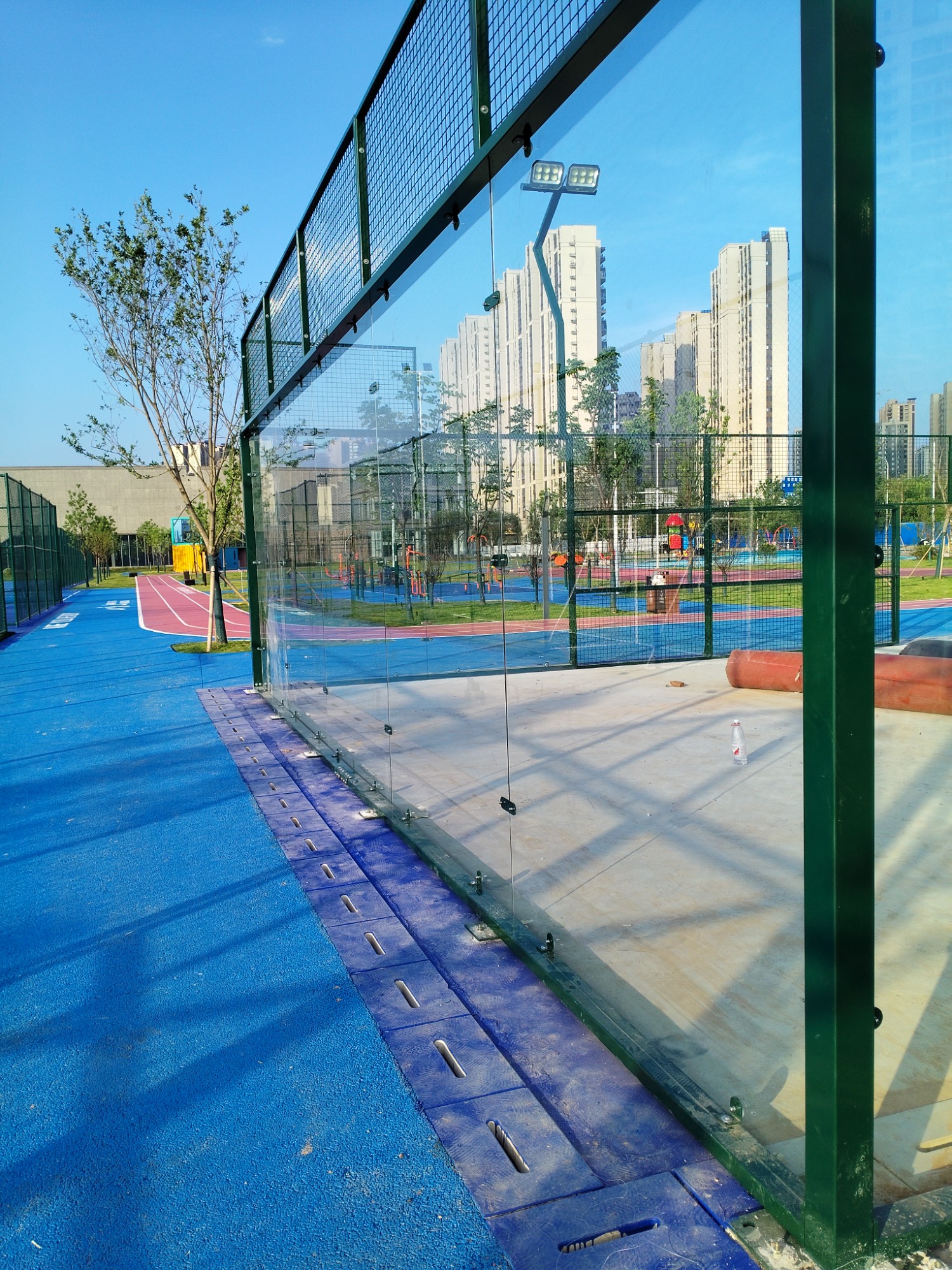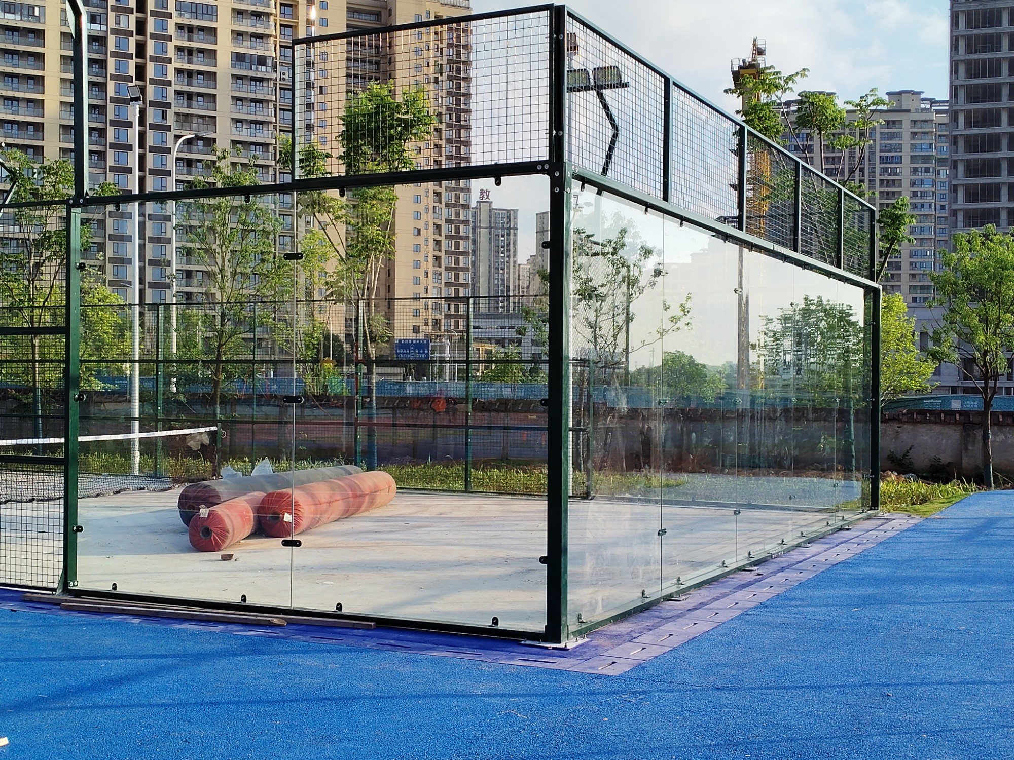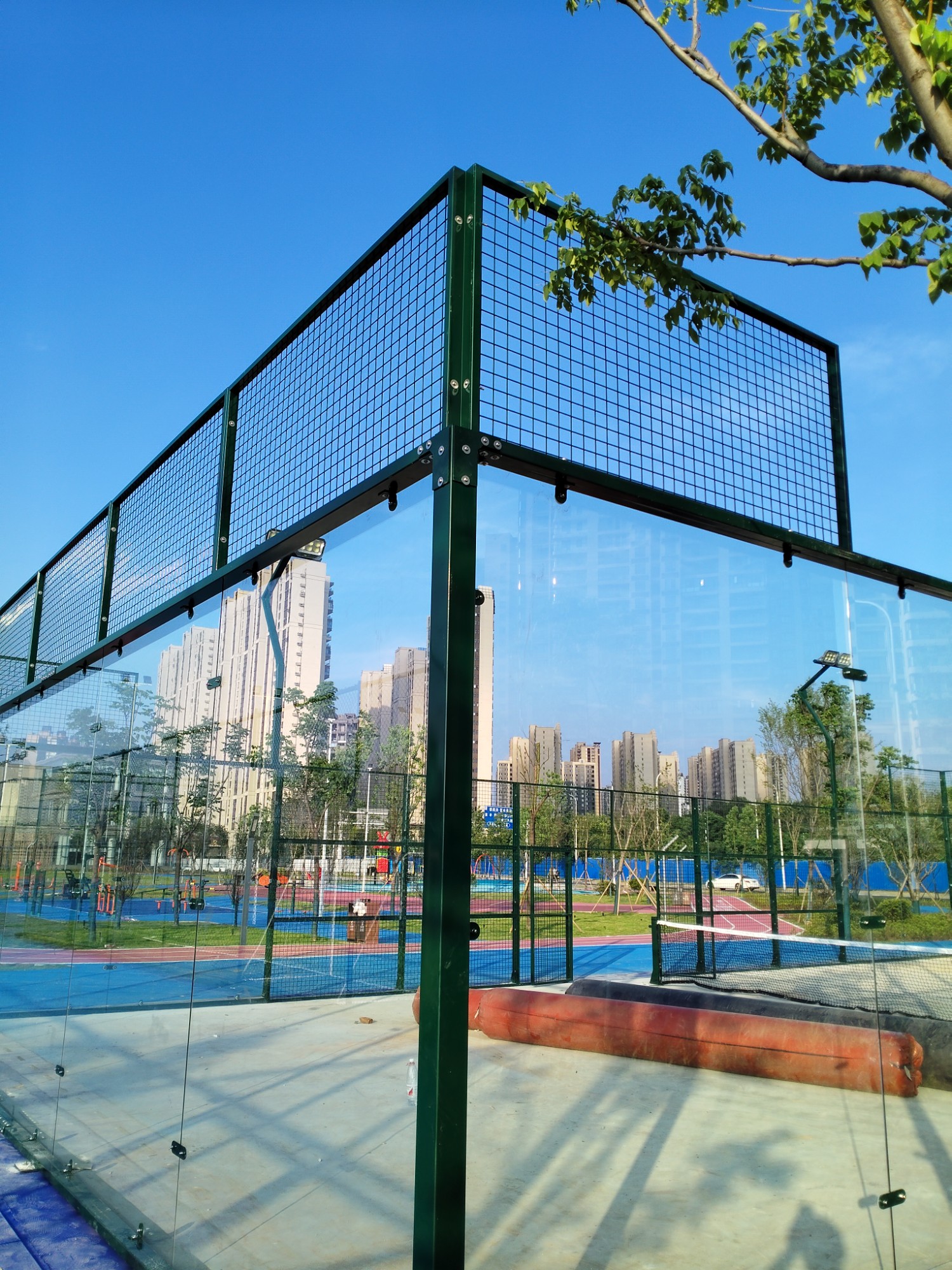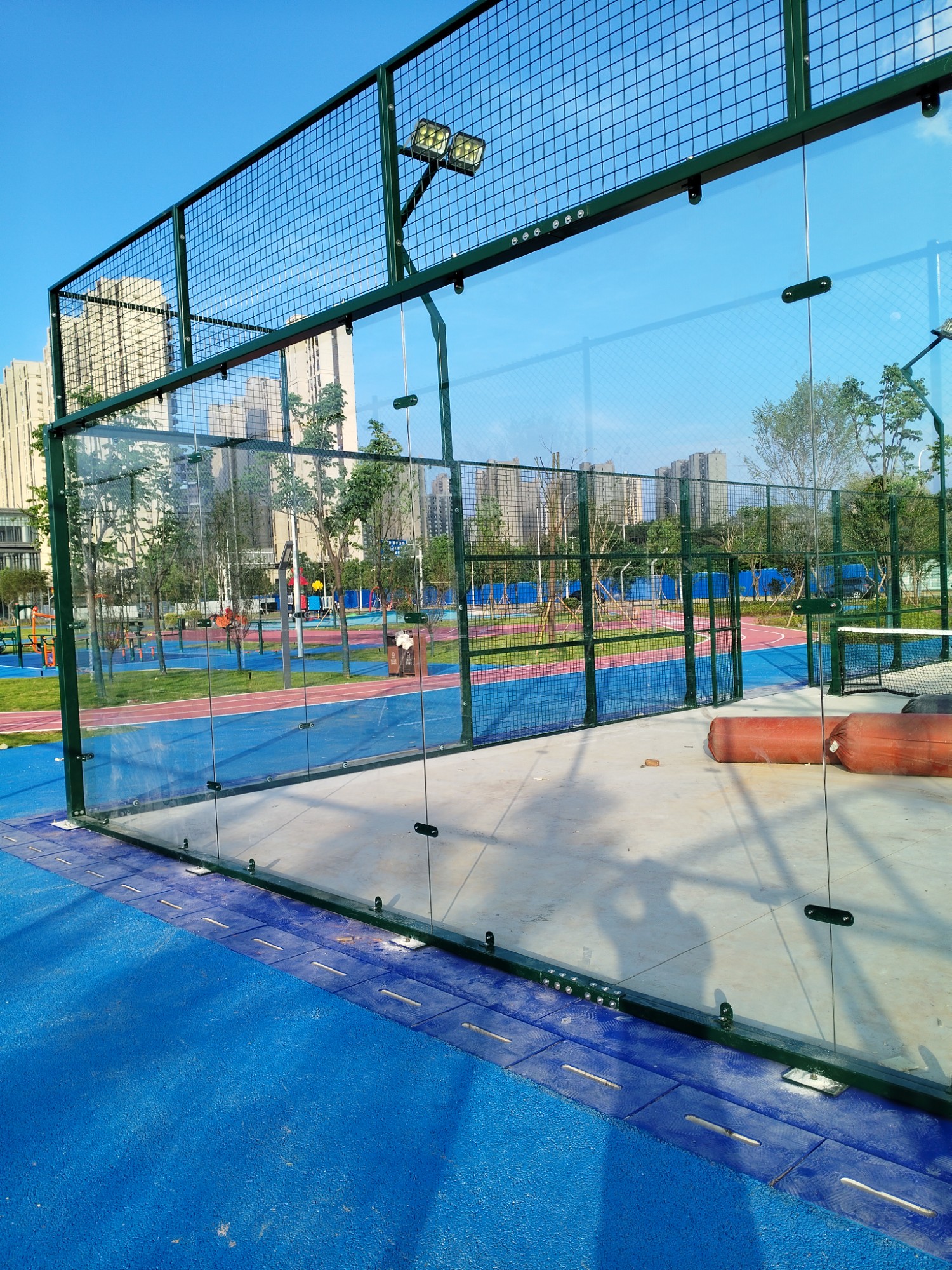 The board-type tennis court net is specifically designed for Padel. It is a fully enclosed protective system that combines a high-strength metal frame, tempered glass barriers, and customized netting structure. The core functions include: